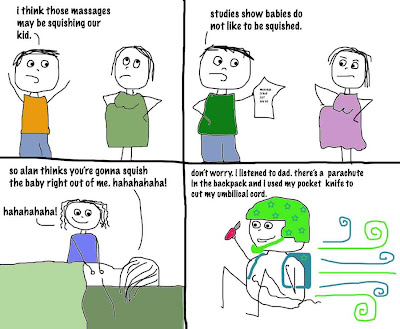 So, my sister Stacey is extremely creative and can do nearly anything. One of her many talents is making great cartoons from our everyday lives. Here are a few of the recent gems! The first one is a cartoon of Alan waking me up during the night to tell me to roll on to my left side. I recently made the mistake of telling Alan that I had read how it is a good idea to sleep on your left side when pregnant because it helps the blood and oxygen get to the baby the best. Ever since, I am awakened at least twice each night by my concerned husband to encourage optimal sleep position!
